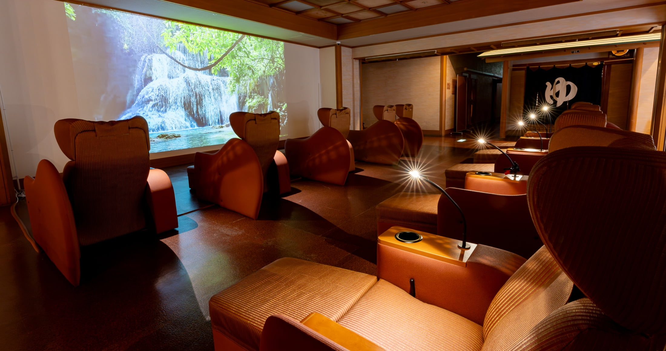 温泉を堪能した後は、湯あがり処のリクライニングソファーで大画面の動画等をご覧いただきながらお寛ぎください。